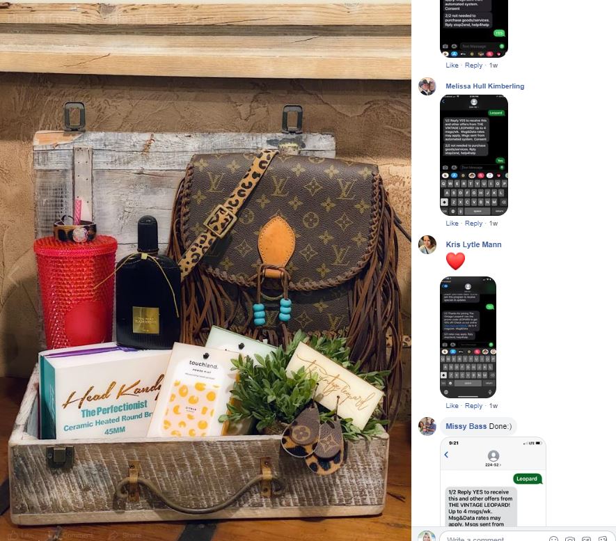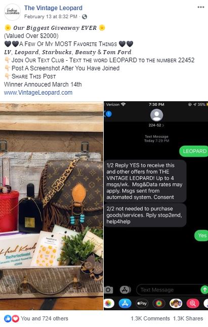 Here are a few examples of how you can first gather subscribers using your social media audience.  Recently, Vintage Leopard,  a SenText Marketing Partner, created this contest with ideal success. They distinctly executed an exciting call to action and asked their audience to engage by texting in,  posting a screenshot, and sharing. Fans freely commented and were truly excited.